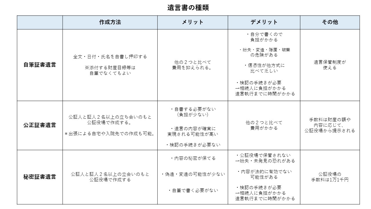 自筆証書遺言・公正証書遺言・秘密証書遺言です。